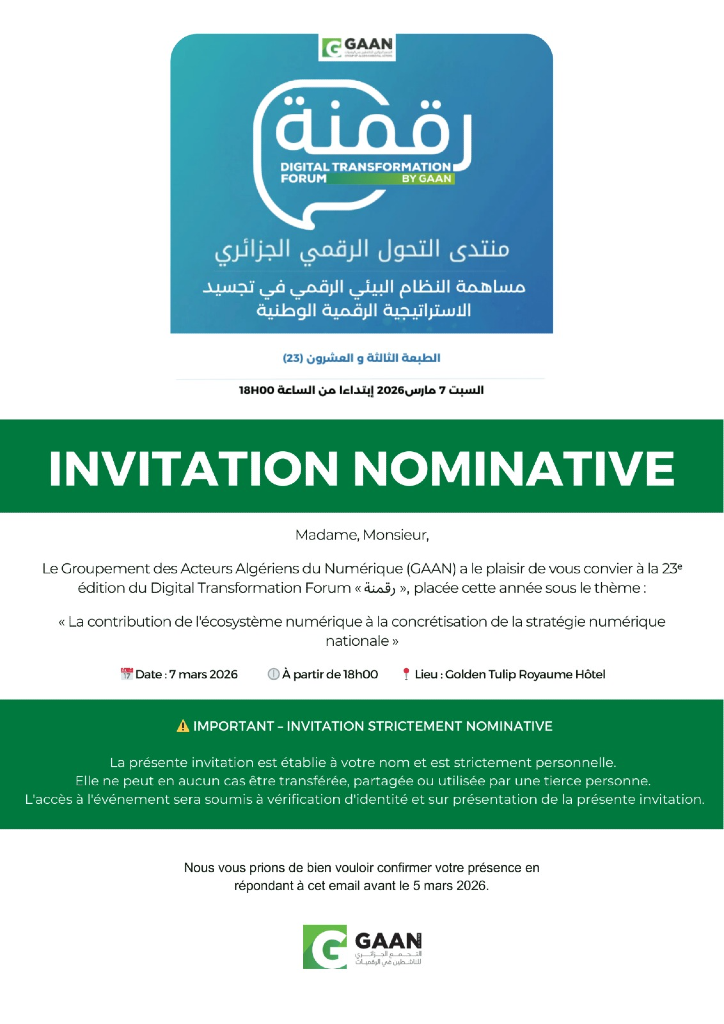 Invitation à la 23ème édition du Forum RAKMANA Détails de l'événement Le samedi 07 mars 2026 (17h00 - 23h00) Lieu : Hôtel Golden Tulipe, Alger, Agérie Nombre de places Nb places Places disponibles Places dispo illimité - 3 0 67 Par Yacine FADLI Lieu de l'événement Détails Participations Bonjour, Ceci est votre invitation personnelle à la 23ème édition du Forum RAKMANA La liste des participants n'est visible que par les personnes connectées et faisant partie de la liste des contacts de l'association.